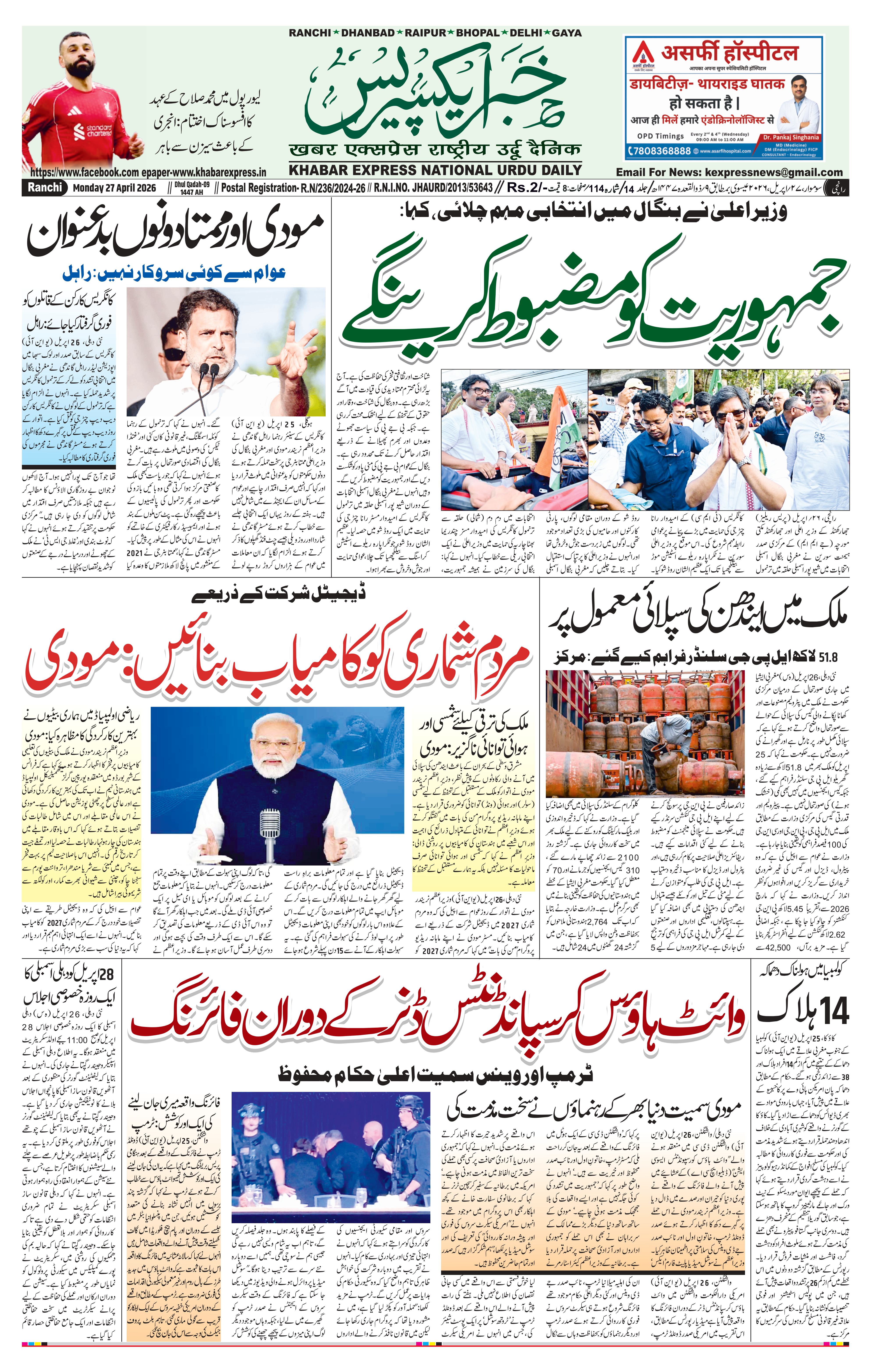 Sun, 26 Apr 2026سنیچر کی شب واشنگٹن کے ہلٹن ہوٹل میں وائٹ ہاؤس کے صحافیوں کے لیے منعقدہ عشائیے کے دوران فائرنگ کا واقعہ پیش آیا۔ میٹروپولیٹن پولیس ڈیپارٹمنٹ کے مطابق مشتبہ حملہ آور کے پاس کئی ہتھیار موجود تھے اور وہ اسی ہوٹل میں رہائش پذیر تھا، جہاں یہ تقریب جاری تھی۔